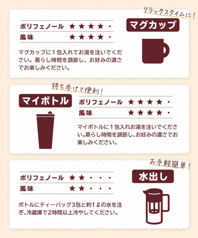 | 煮だしの場合:水400ml〜500mlを沸騰後、ティーバッグを1包入れ、弱火で3〜5分煮出して下さい。火を止めて10〜15分後にティーバッグを取り出して下さい。 ティーポットの場合:ティーバッグを1包入れ、熱湯を注ぎ3〜5分蒸らしてお召し上がりください。 ※味の濃淡はお好みに応じ、お湯の量、浸出時間、分包数で調整してください。 |