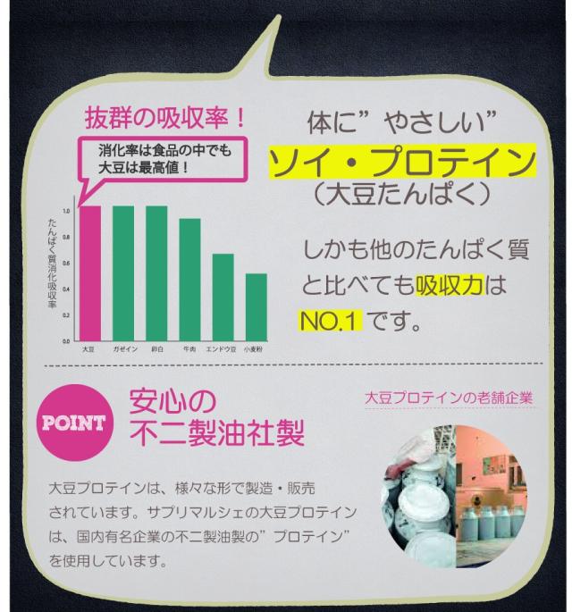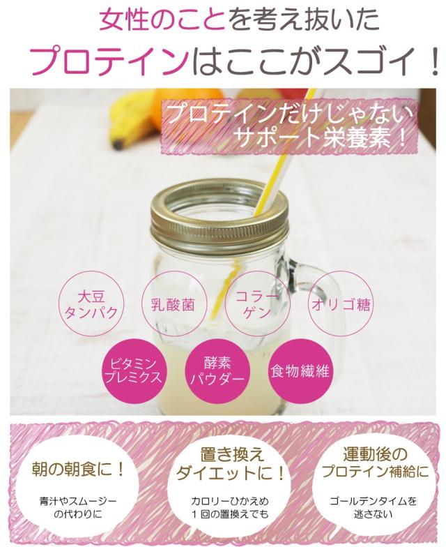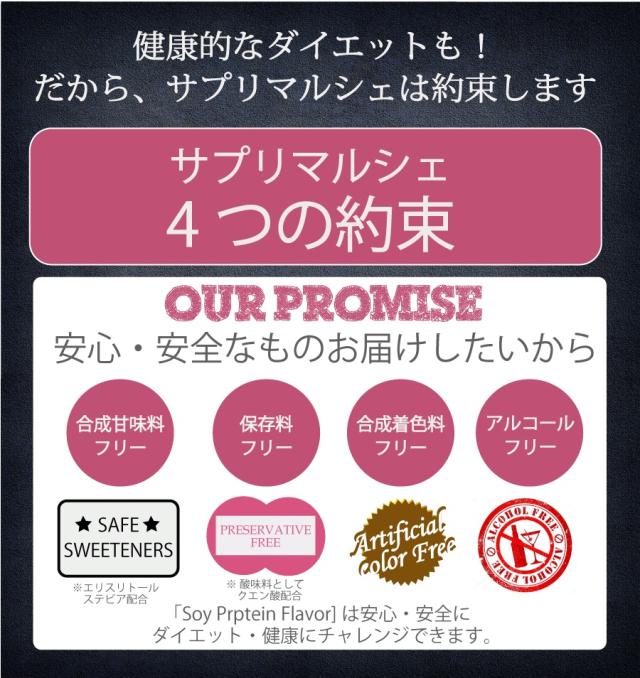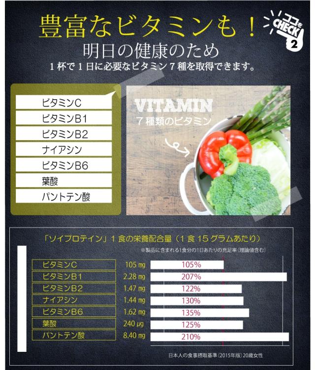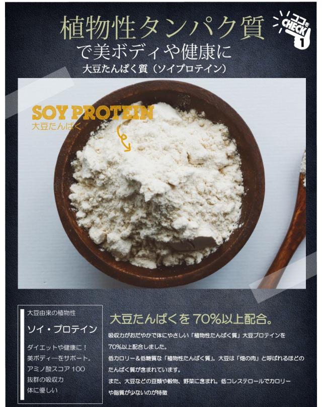 | 原材料 | 粉末状大豆たんぱく(国内加工)(大豆たんぱく、食用植物油脂)、 難消化性デキストリン、デキストリン、コラーゲンペプチド(ドイツ)、 オリゴ糖、乳酸菌末、ビフィズス菌、酵素パウダー、 /甘味料(ステビア、エリスリトール)香料(原料に一部乳を使用)、ビタミンB1、ビタミンB2、ナイアシン、ビタミンB6、 葉酸、ビタミンB12、パテントン酸、ビタミンC、 ※ヨーグルト・ミックスフルーツ・グレープにクエン酸、 プレミアムコーヒーにコーヒーパウダー、リッチチョコレートにココアパウダー |