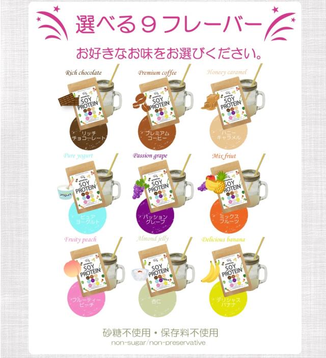 植物性100%プロテイン使用 7種類のビタミンが1日分取れる 9種類のフレーバー |
