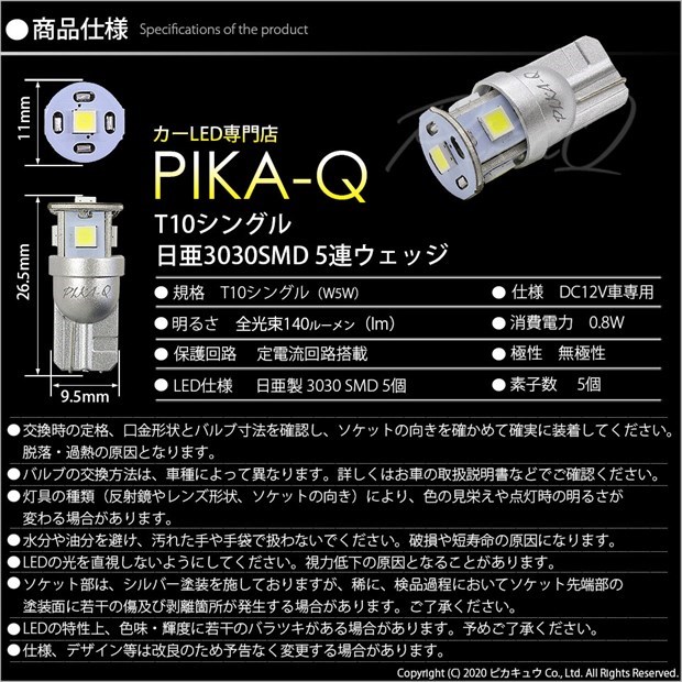 | ピカキュウ,LED専門店,LEDバルブ,LED,SMD,T10,W5W,日亜化学工業,日亜,3030,ライセンスランプ,番号灯,爆光,140lm,140ルーメン, |