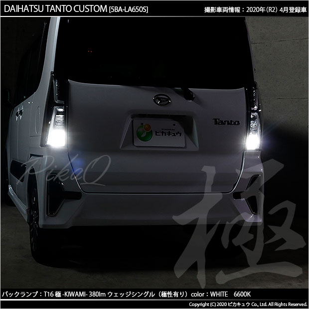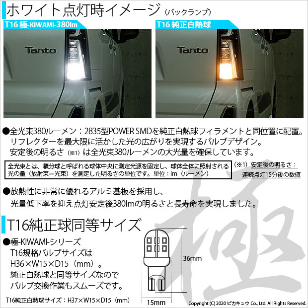 | ピカキュウ,LED専門店,LEDバルブ,国産DC12V車,LED,SMD,T16シングル,W16W,バックランプ,ホワイト,全光束380lm,ハイブリッド車対応,極,KIWAMI,きわみ,DAIHATSU,TANTO CUSTOM,ダイハツ,タントカスタム,LA650S,LA660S |