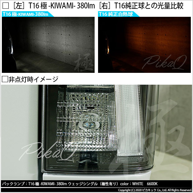 | ダイハツ タントカスタム[LA650S/LA660S]対応バックランプ用 LEDバルブ T16 極-KIWAMI-(きわみ)全光束380lm ウェッジシングル球 LEDカラー:ホワイト 色温度6600K 1セット2個入り | ||||