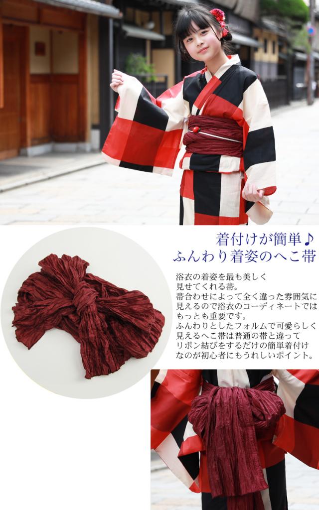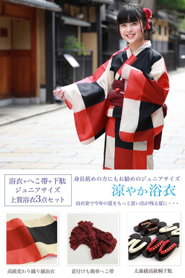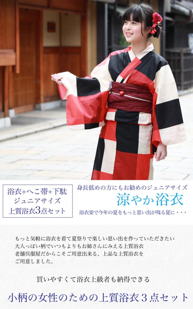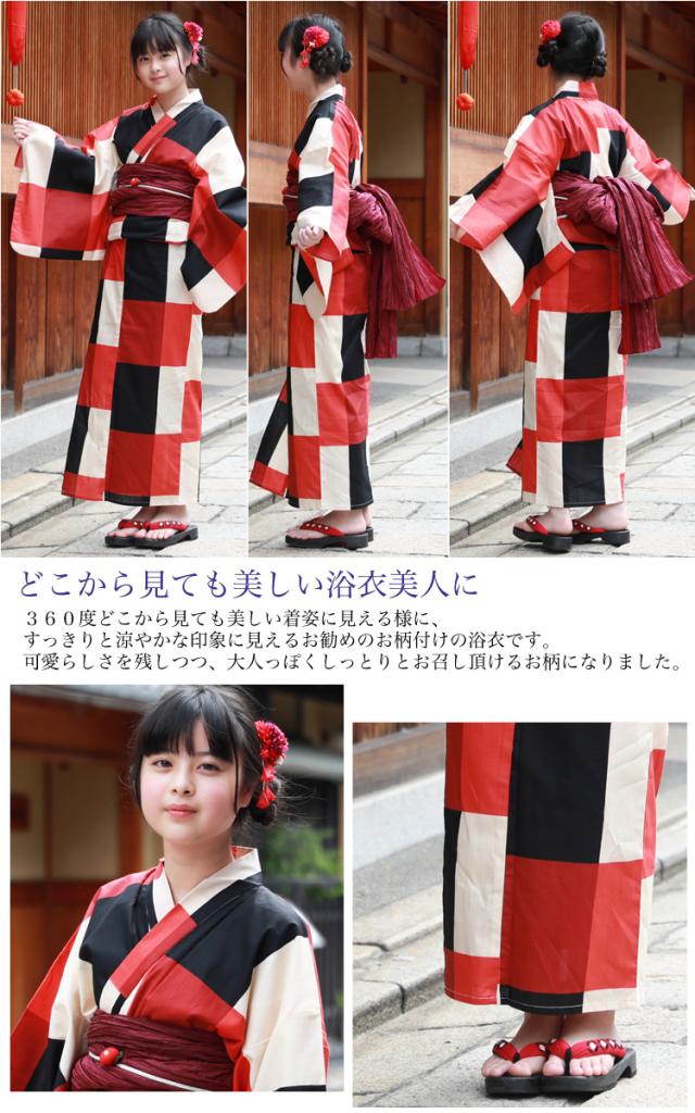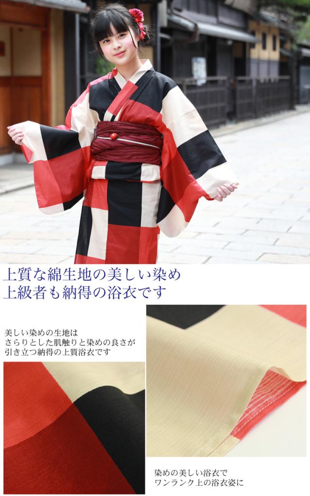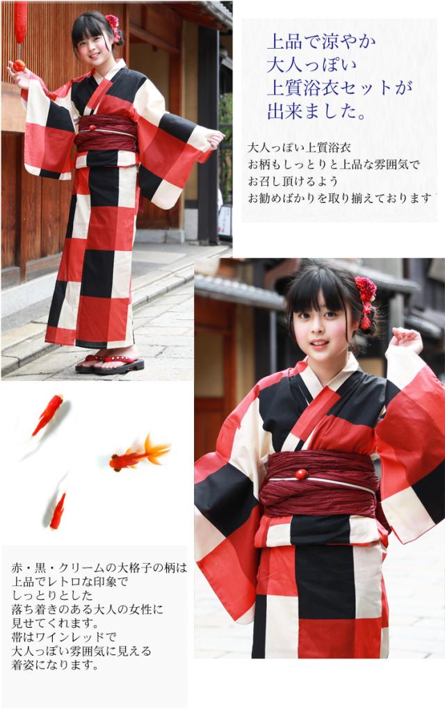 浴衣 セット ジュニア レディース 変わり織り綿浴衣3点セット 「赤・黒・クリームの大格子」 へこ帯 Sサイズ 2021 浴衣セット ジュニア 子供 レトロ モダン 150cm 140cm