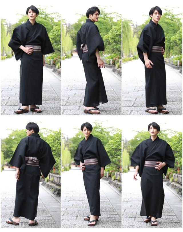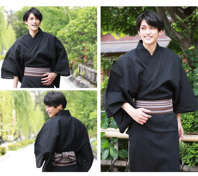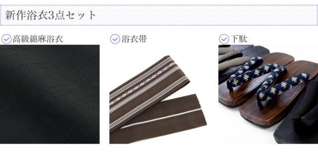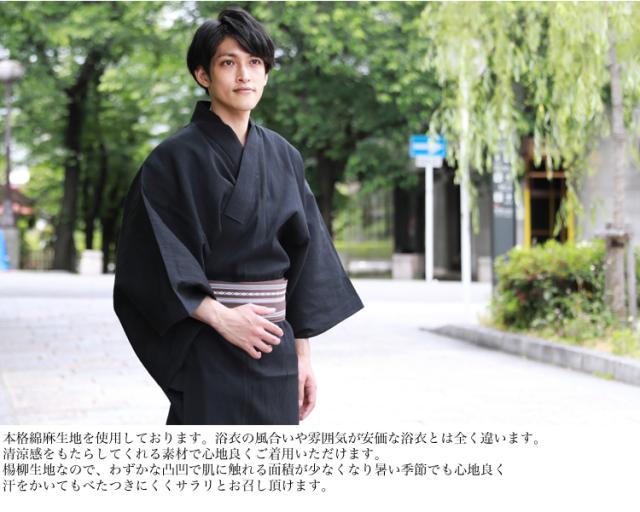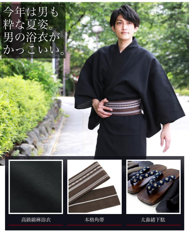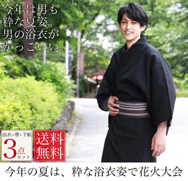 浴衣 メンズ セット 男物高級綿麻浴衣3点セット「無地黒地」父の日ギフト 男性 男 レトロ 大人 高級綿麻浴衣 角帯 下駄 M L LL