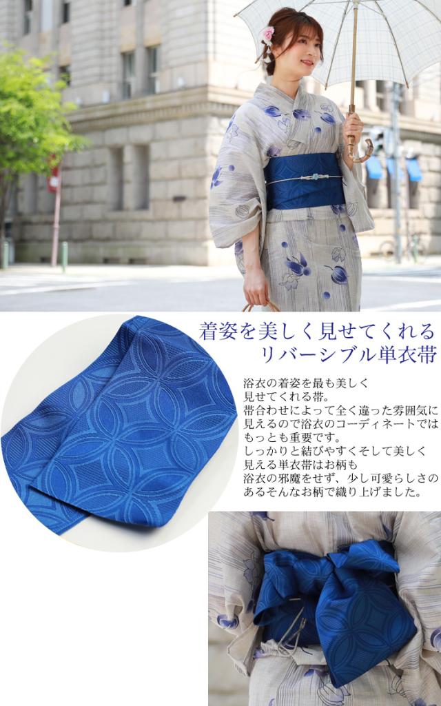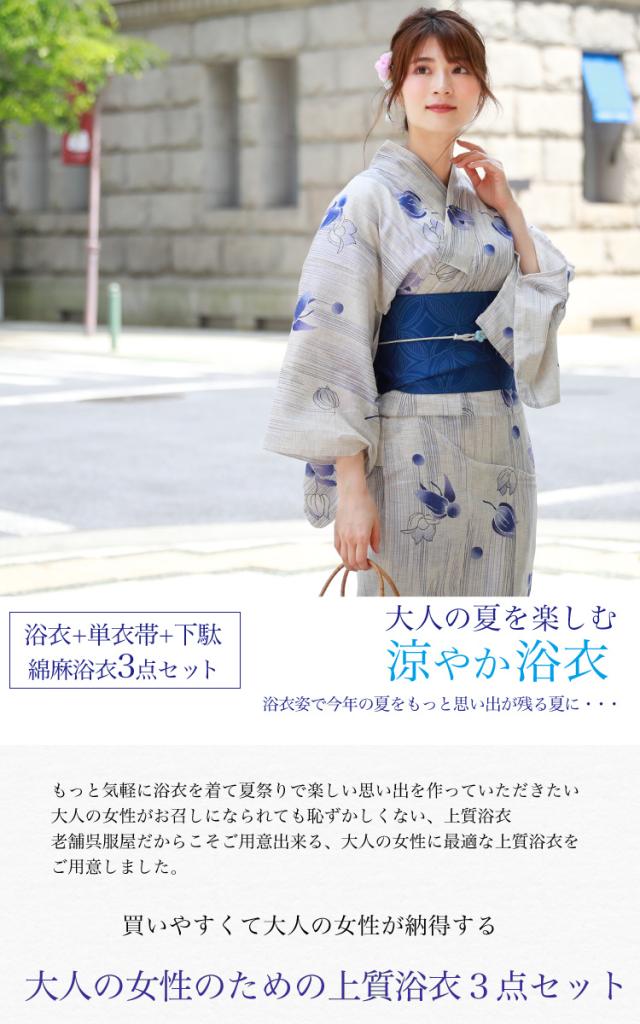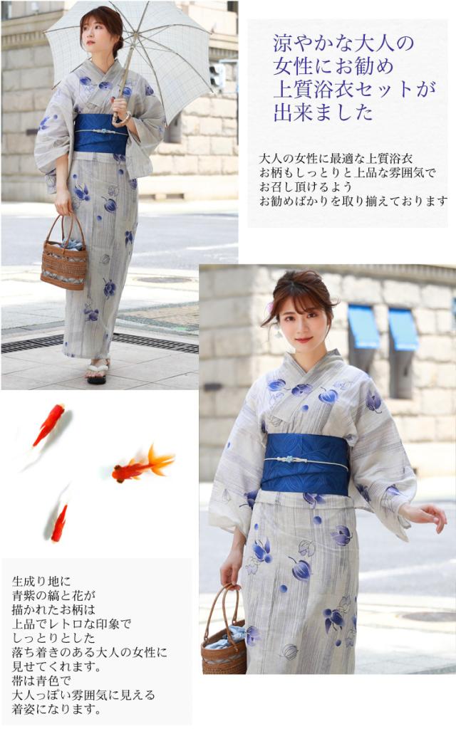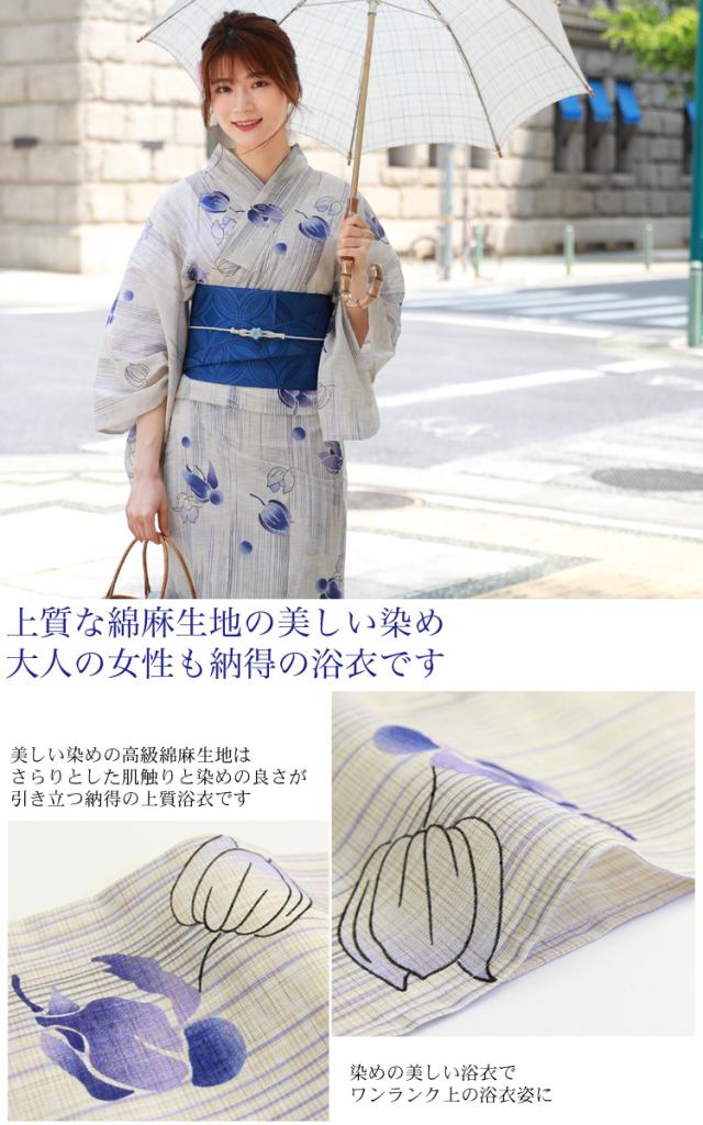 浴衣 セット レトロ 高級変わり織り綿麻浴衣3点セット「生成り地に青紫の縞と花」浴衣 生成り 浴衣帯 青 レディース 古典柄 大人 モダン しっとり