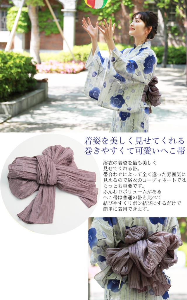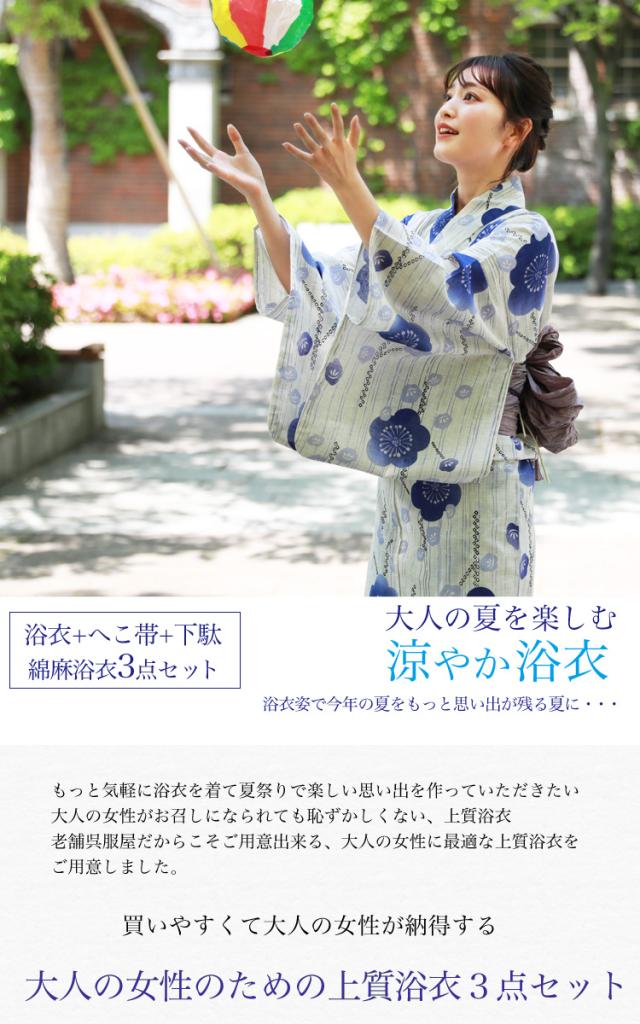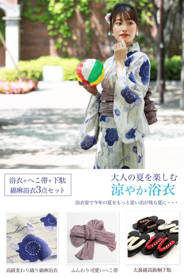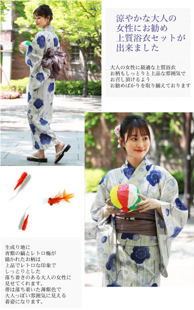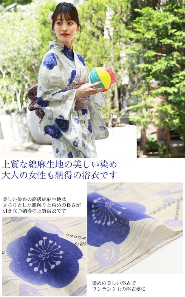 浴衣 セット レトロ 高級変わり織り綿麻浴衣3点セット「生成り地に青紫の縞とレトロ梅」浴衣 生成り 梅 浴衣帯 紫 へこ帯 兵児帯 レディース 古典柄 大人 モダン しっとり 2021