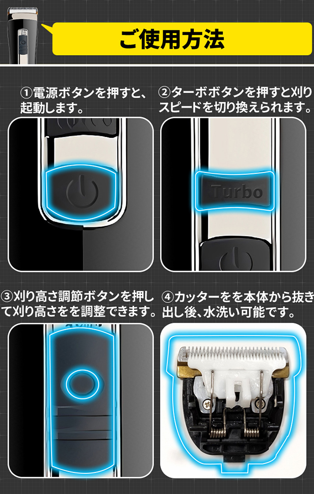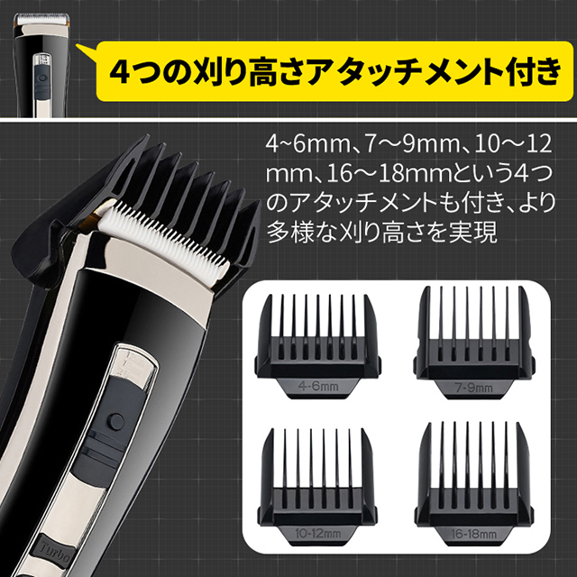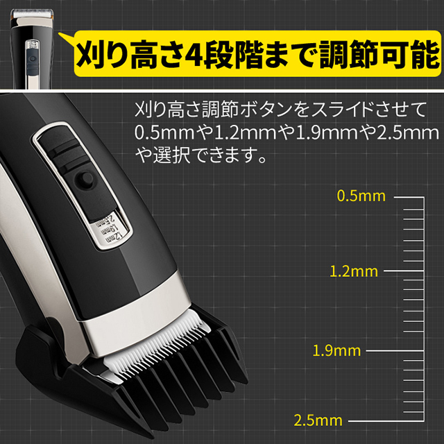 【スライド調節式バリカン】 カットしたい長さを簡単に調節できます。スライド式4段階の刈り高さ(0.5mm、1.2mm、1.9mm、2.5mm)が設定出来ます。また4種類ガイドコーム(4-6、7-9、10-12、16-18mm)付き、効率よくカットできます。