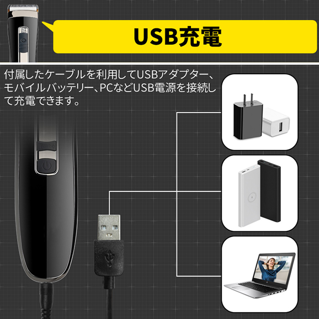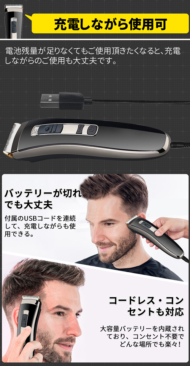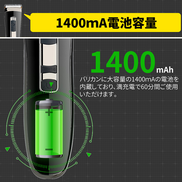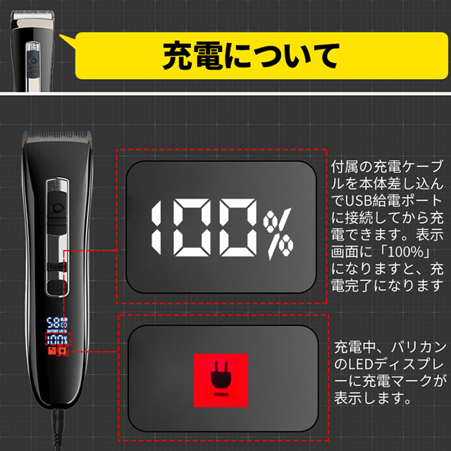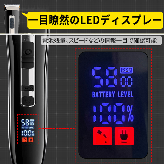 【USB充電&LEDディスプレイ】 充電式の「兼用タイプ」電動バリカンで、コードもコードレスも使え、バリカン本体は大容量1400mAhリチウムイオン電池を付き、充電2時間以上で60分連続使用可能です。LED液晶ディスプレイで、電源残量表示、低バッテリー提示、ターボ情報が液晶画面に表示されるため、一目でわかりやすく快適に使用できます。