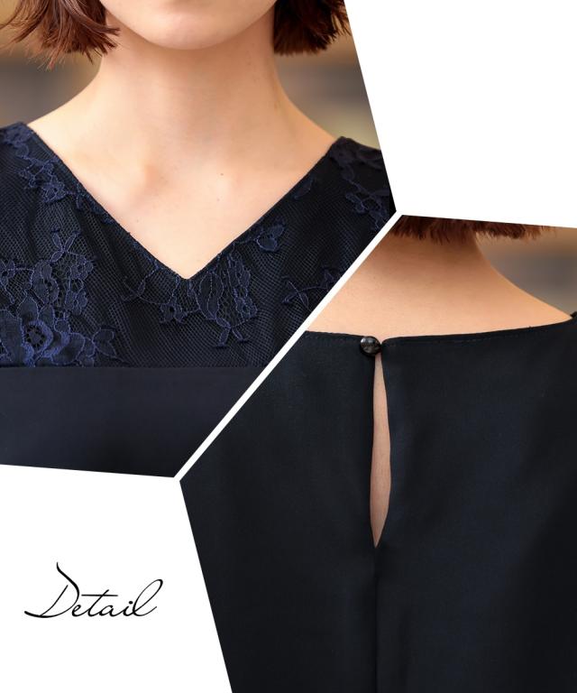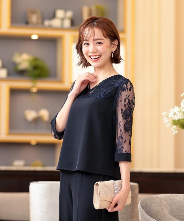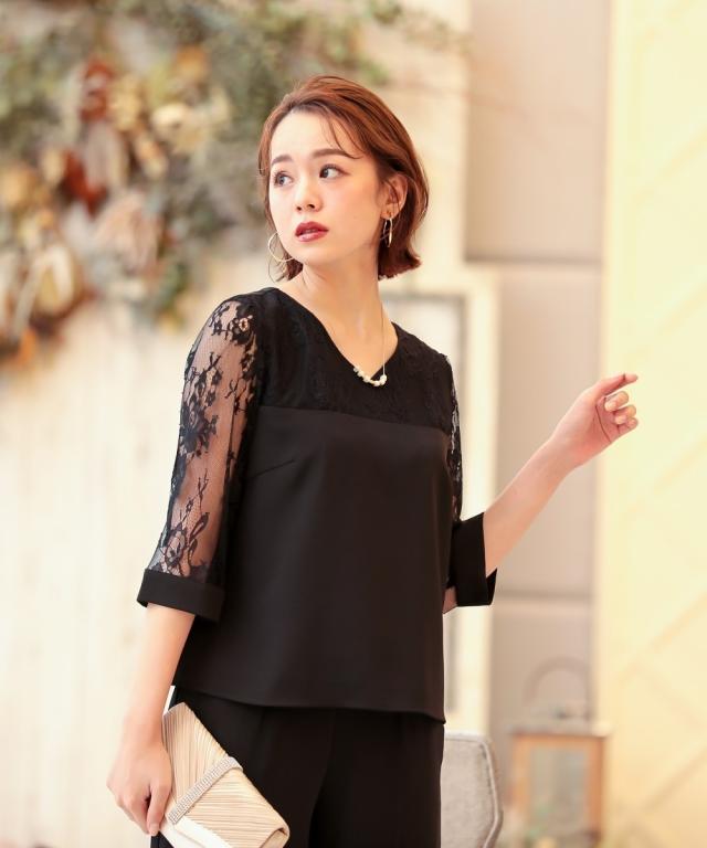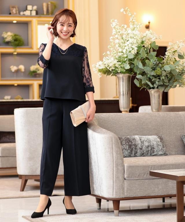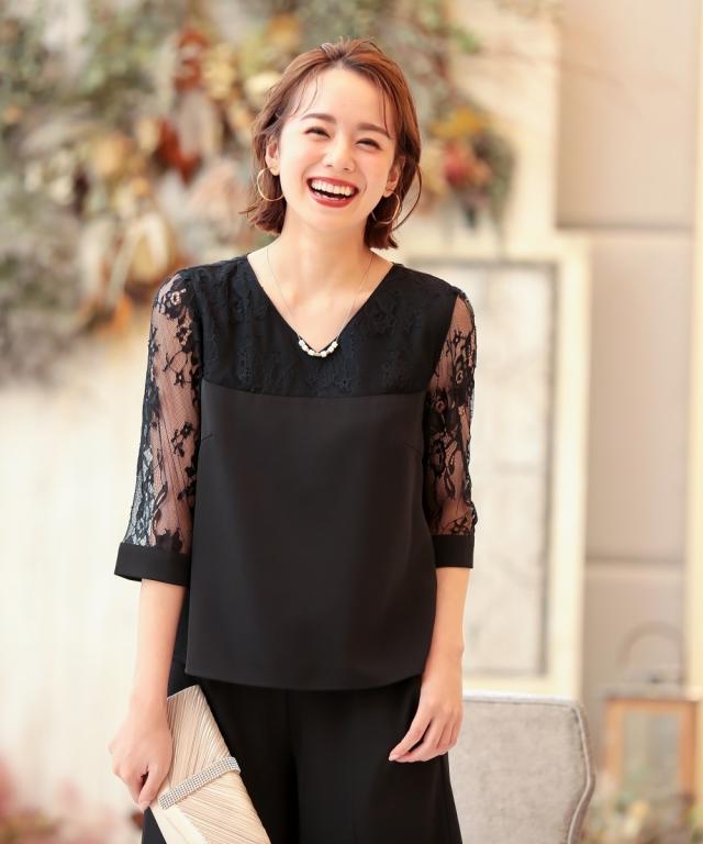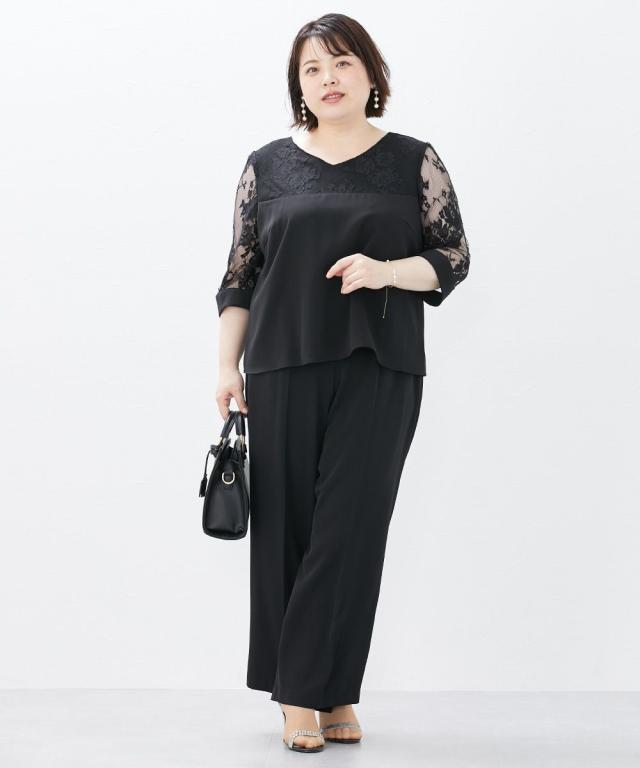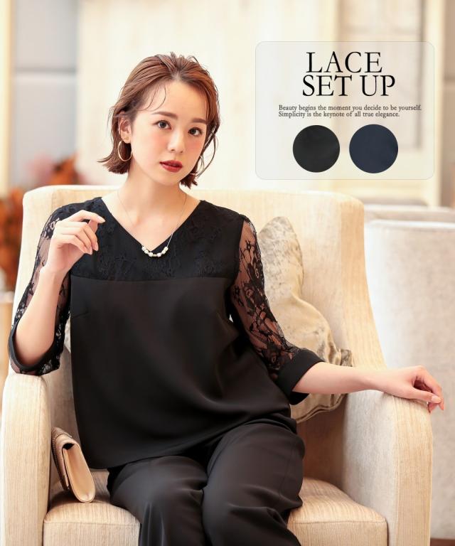 Vネックレースブラウス+ワイドパンツセットアップドレス【結婚式・二次会・お呼ばれ対応】<大きいサイズ有>