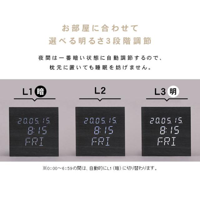 夜間は一番暗い状態に自動調節するので、枕元に置いても睡眠を妨げません。