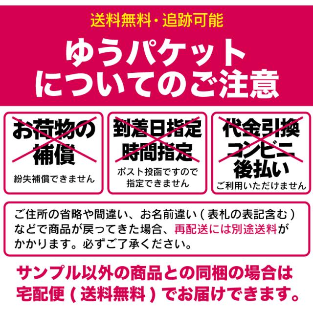 | 注意事項 | 【お支払いについて】 ※弊社からの連絡前にお振込を完了いただきましても、差額分は返金できませんのでご了承ください。 【配送について】 ※ゆうパケットでの配送のみ送料無料となります。 (ご自宅の郵便ポストへお届けいたします。)また、混雑時は、3営業日以内のお届けとなります。 ※サンプル以外の商品を同時にご注文された場合、宅急便での同梱となります。 ※紛失・破損に関して、弊社では一切の責任は負えません。 ※送付先のご住所間違い・表札違い・マンション名省略や、転居届などが出ていないと正確にお届け出来ない場合がございます。今一度ご確認ください。 上記内容について、必ず同意頂いた上でご注文ください。 |