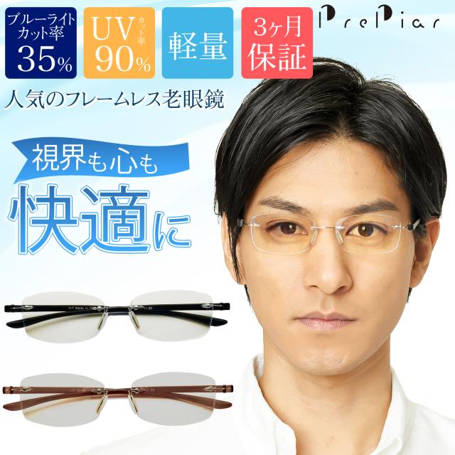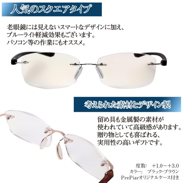 老眼鏡 おしゃれ シニアグラス フチなし ブルーライトカット ケース付き 3ヶ月保証 フレームレス コンパクト 携帯用 スクエア ブラック ブラウン メンズ PrePiar【117】