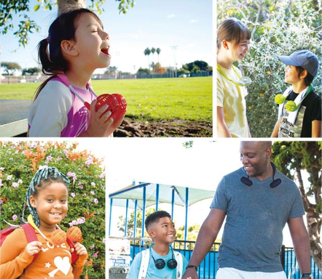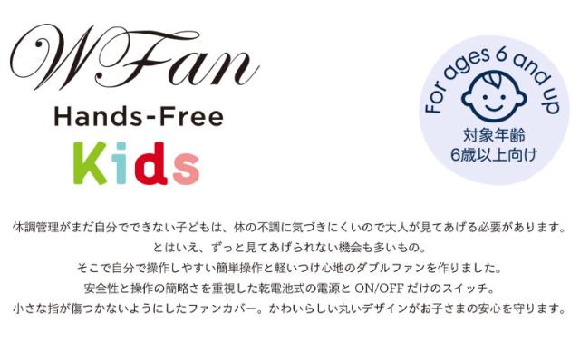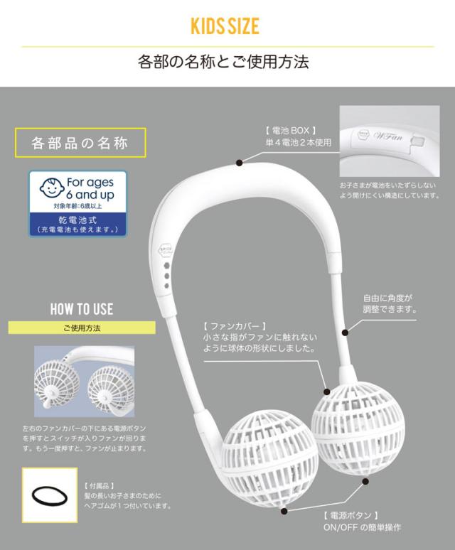 ■暑い時、暑い場所でいつでもどこでも、首にかけるだけのキッズ用携帯用扇風機です。