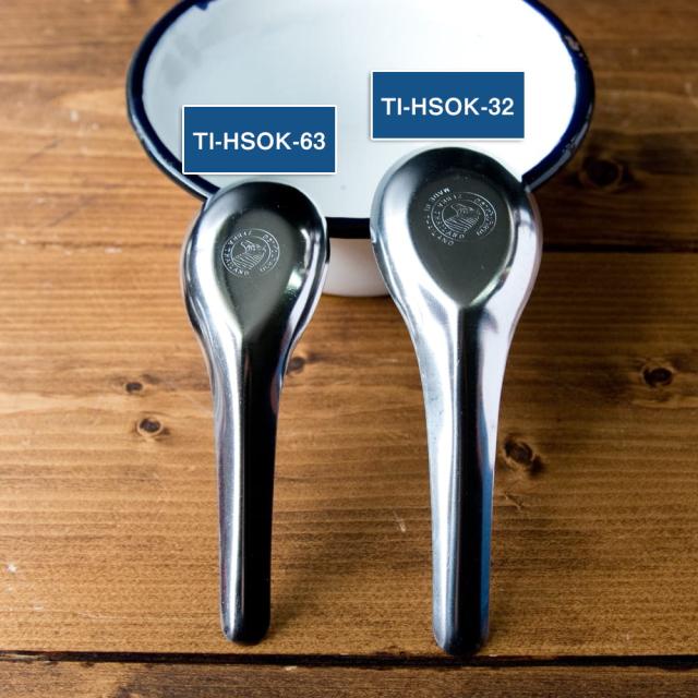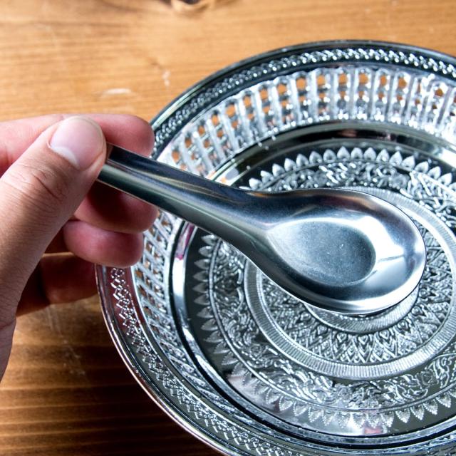 タイの街角屋台でよく見かけるステンレス製の蓮華です。タイでは、箸とスプーン又は、フォークとスプーン(蓮華など)を両手に持って、スープやご飯を口へ運びます。茶碗を手に持って食べたり、茶碗に口をつけたりしないのがマナー。蓮華は、タイ料理の必需品なのです。日本では、陶器製やプラスチック製などが使われますが、タイの屋台では、薄いステンレス製や厚みのないプラスチック製などがよく使われています。■現地感たっぷり!