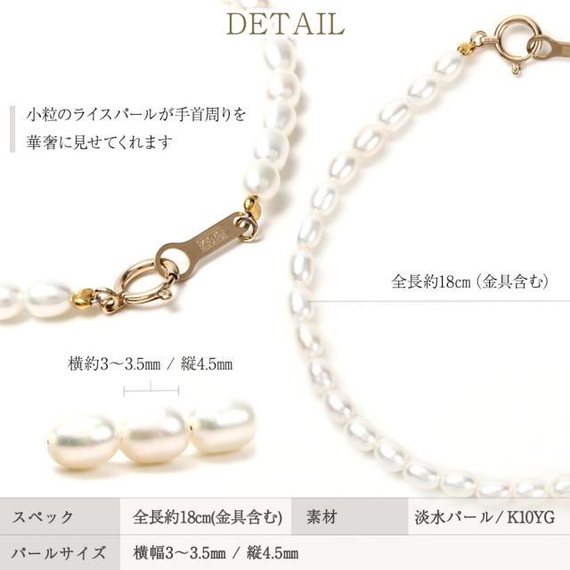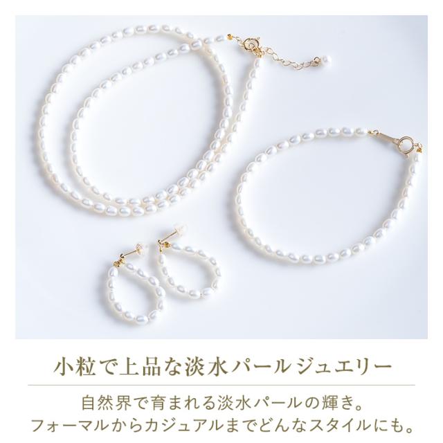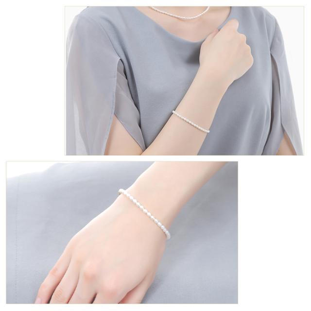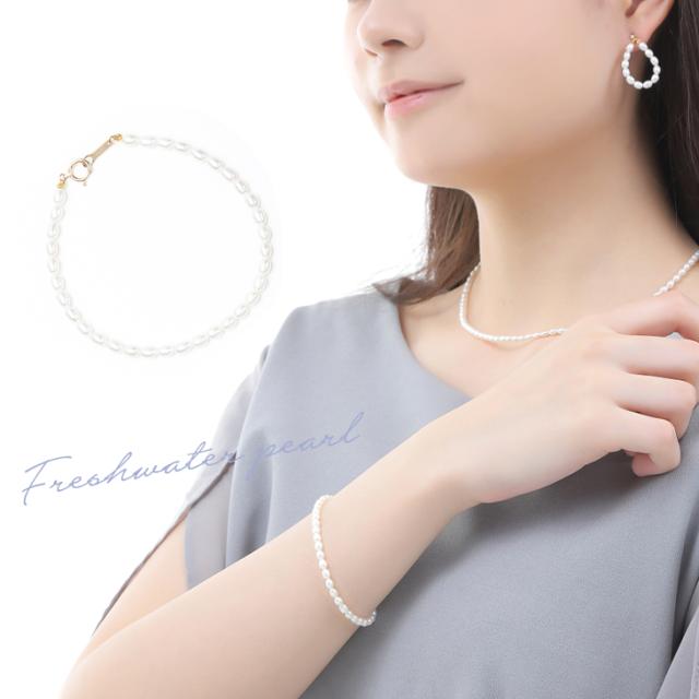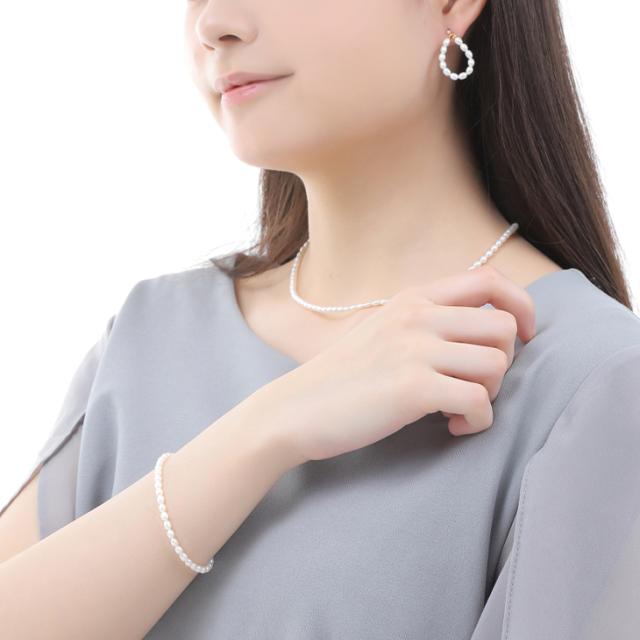 小粒のライスパールはフォーマルからカジュアルなコーディネートまで幅広く合わせられます。ライスパールのブレスレットは上品で繊細な印象を与えます。