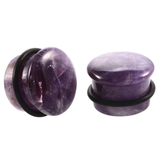 片側が広がって、もう片側がゴムのキャッチになったシングルフレアやビュレッツのような形状の天然石の紫水晶で作ったストーンボディピアス。