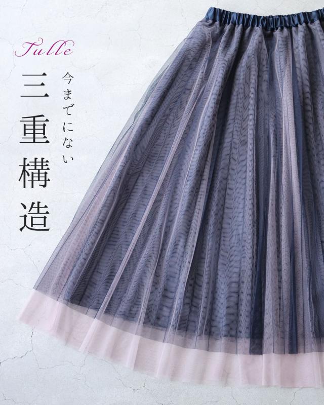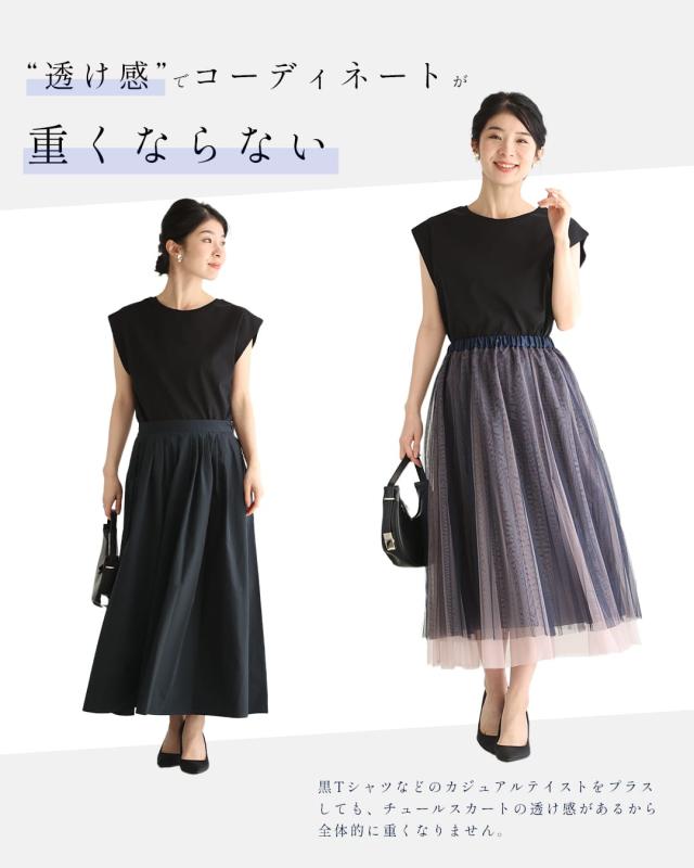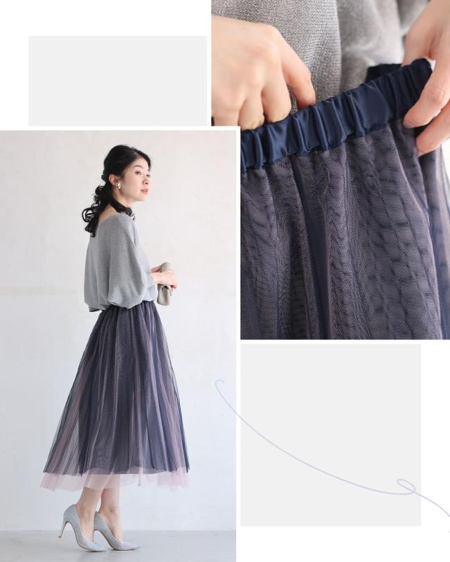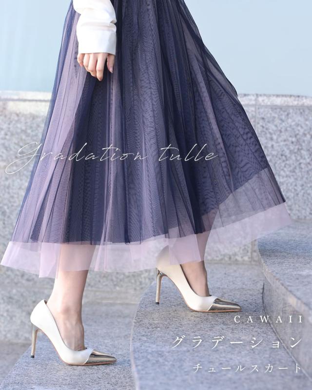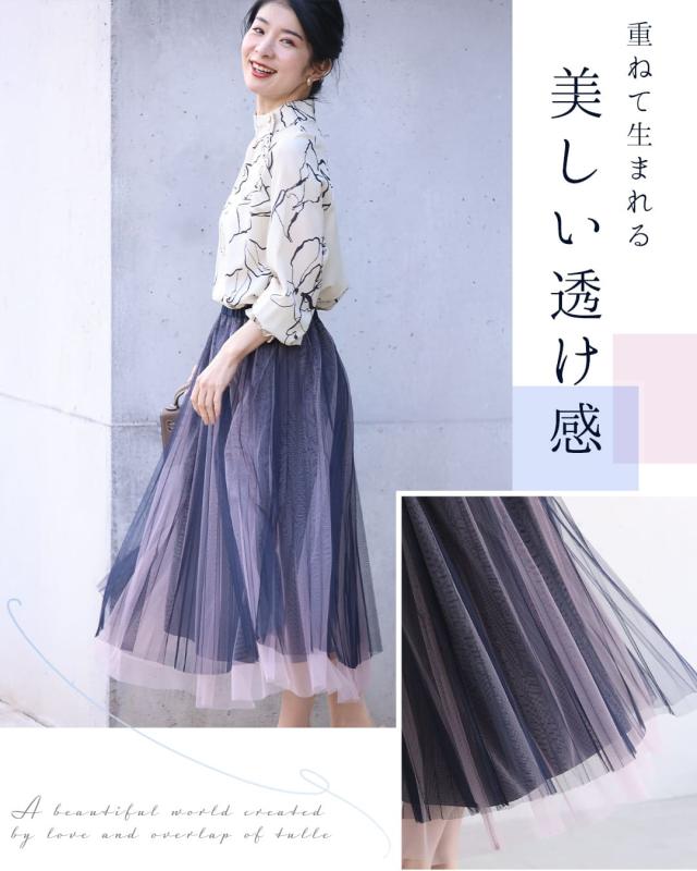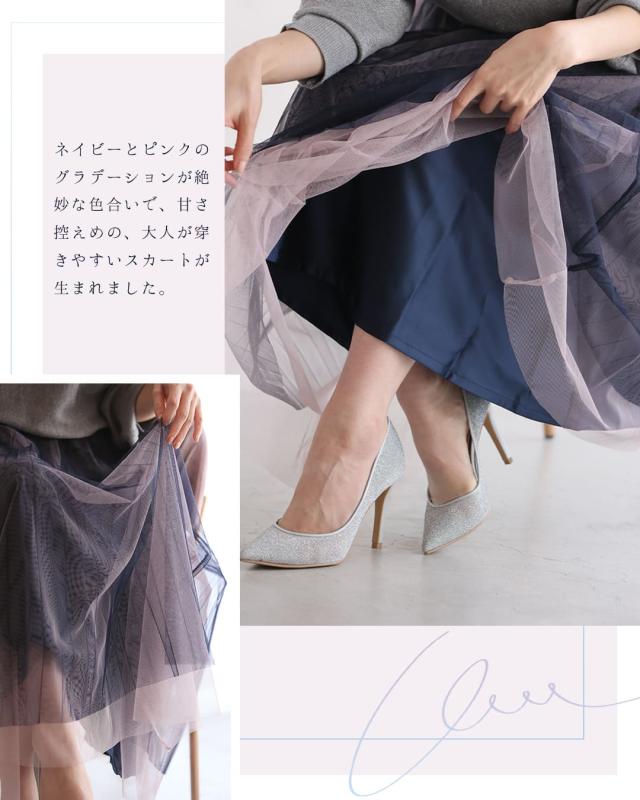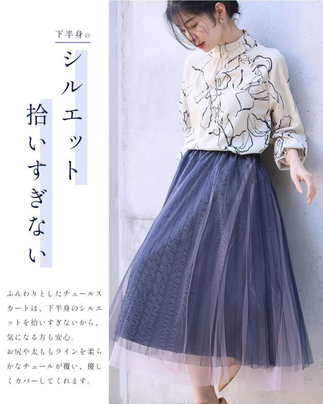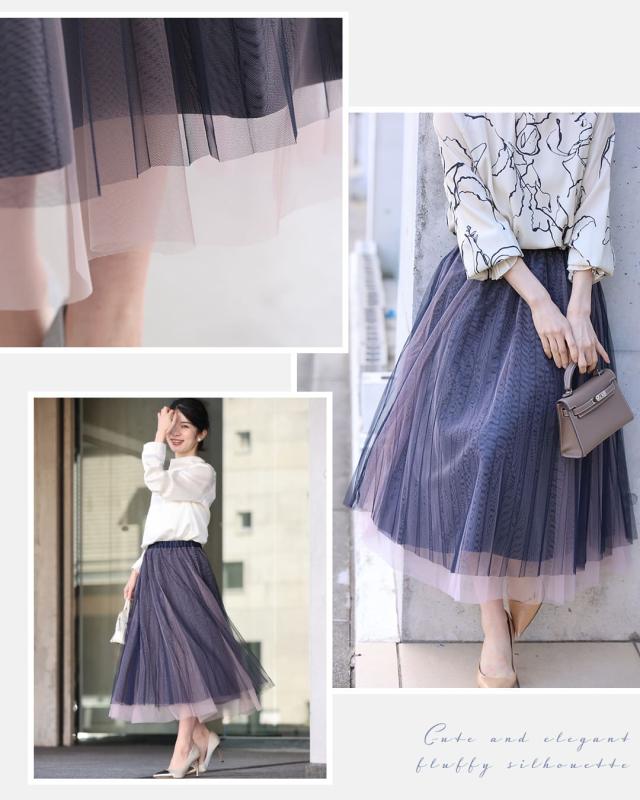 再入荷12月14日 (ネイビー)(S~L/2L~3L対応)グラデーション チュール スカート ふんわり 上品 ボリューム感 ブルー cawaii w67426 春 夏 フレアスカート スカート ミモレ ロングスカート お呼ばれ 通勤 きれいめ 春 夏 オフィス お呼ばれ 通勤 きれいめ 上品 涼しい 洗える