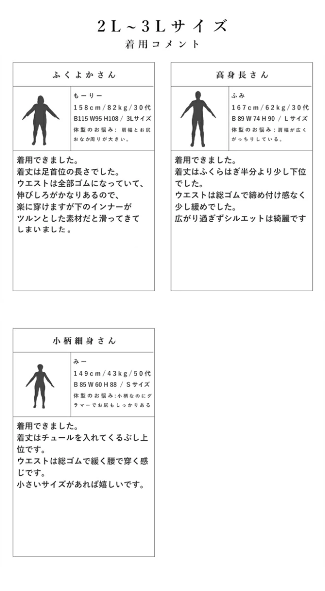 | 【SL】モデル着用 ウエスト 60-104 cm 総丈 79 cm 裏地丈 70 cm 【2L3L】 ウエスト 66-110 cm 総丈 82 cm 裏地丈 73 cm | 素材 表地 ポリエステル100% 裏地 ポリエステル95%・ポリウレタン5% 手洗い 可 メール便 不可 生産国 中国 モデル / 155cm 42kg |