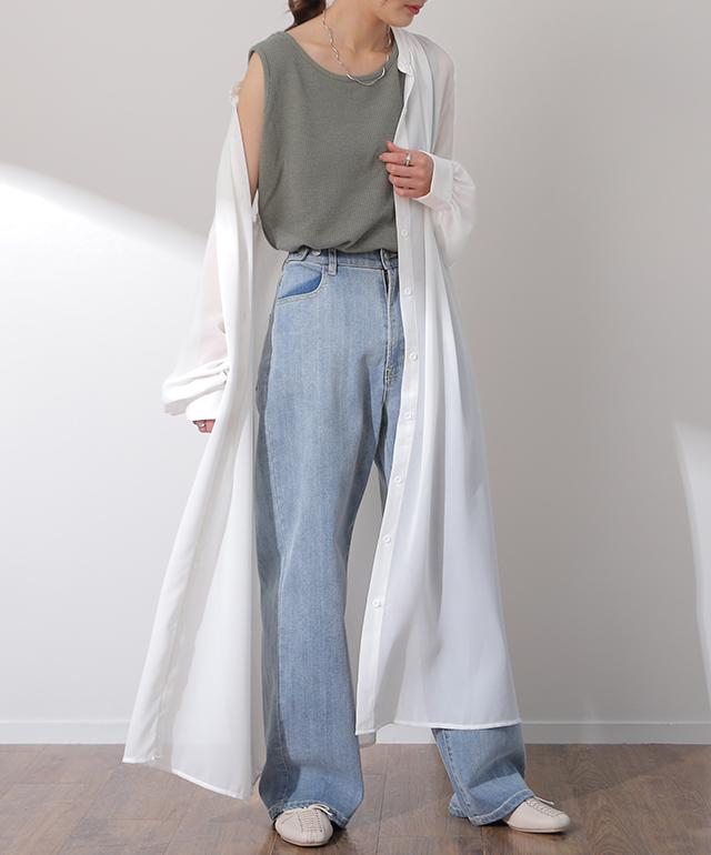 トレンドのシアー感に加えバンドカラー・サイドスリットと
