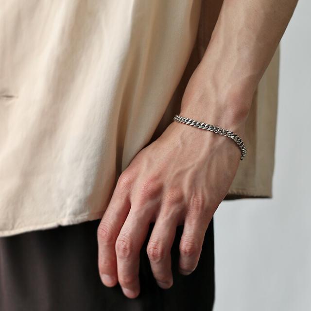 年代を問わず根強い人気の喜平ブレスレット。喜平ブレスレットの中では細めのチェーン幅なので、様々なコーデにさり気なく取り入れることも可能。シンプルなコーデにさらりと着けて、さり気なくワイルドさを演出するのがオススメです。