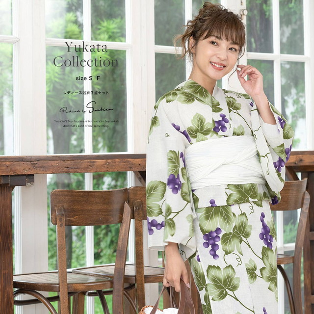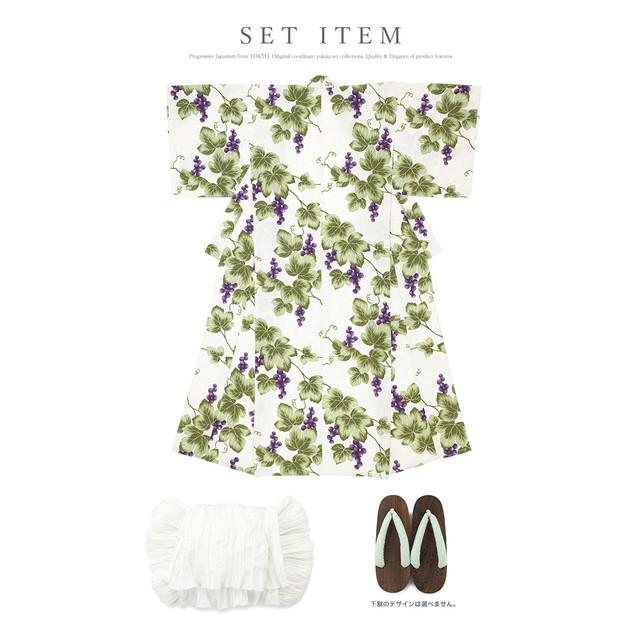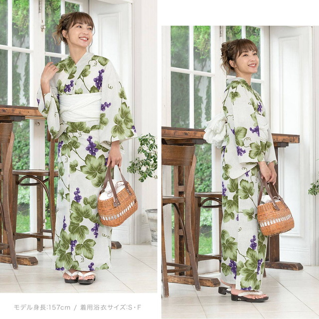 即納【レディース浴衣3点セット】ベージュ/緑/紫/葡萄唐草/変わり織り/30代/40代/女性/大人/S・フリー/送料無料