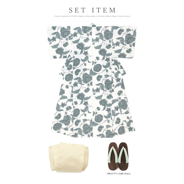 こちらの商品は、浴衣・帯・下駄の3点セットです。セット内容の一部変更や、それに伴う値引きは承っておりません。