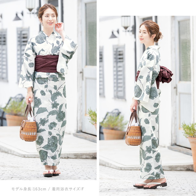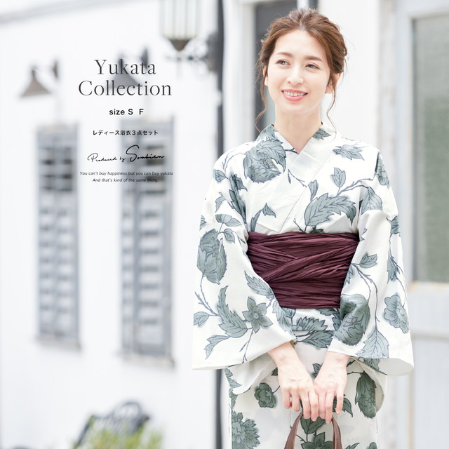 即納【レディース浴衣3点セット】白/灰色/牡丹/ダリア/花唐草/変わり織り/30代/40代/女性/大人/S・フリー/送料無料