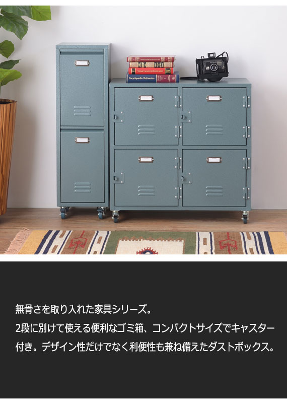 | 説明 | 無骨さを取り入れた家具シリーズ。 2段に別けて使える便利なゴミ箱、コンパクトサイズでキャスター付き。 デザイン性だけでなく利便性も兼ね備えたダストボックス。 |
