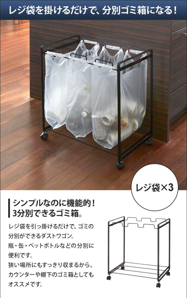 レジ袋の持ち手を掛けるだけ!3分別できるダストワゴン。