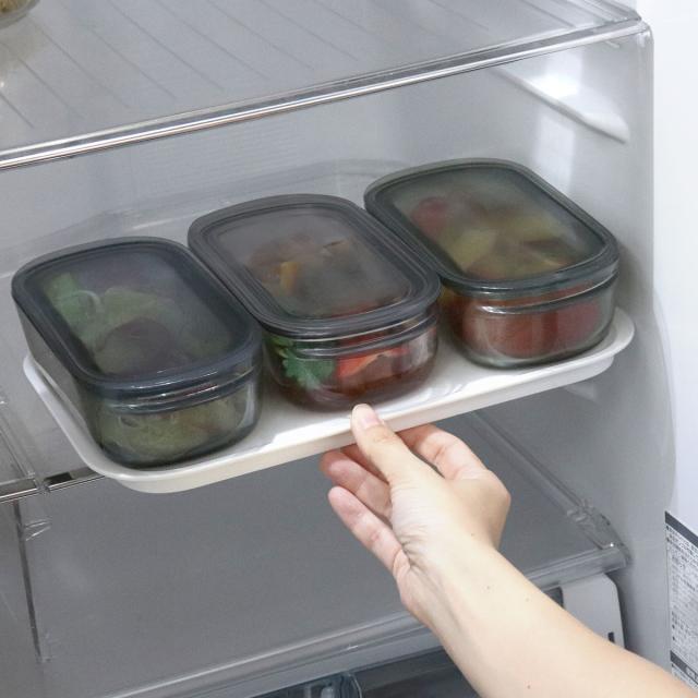 保存容器単品を冷蔵庫内に収納すると、奥の方に入れた容器や、重ねた下の段の容器がどうしても取りにくくなります。しかし、このトレーを使えば取りたい容器をまとめて取り出せて便利です。冷蔵庫内の空間を無駄なく有効活用でき、すっきりと整理整頓ができます。