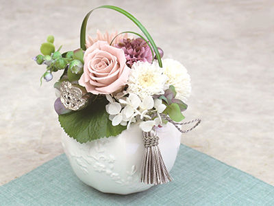 菊だけではなく、バラ、ハスの実、アジサイなどを使用した供花はデザイン性が高くインテリアにも馴染みます。