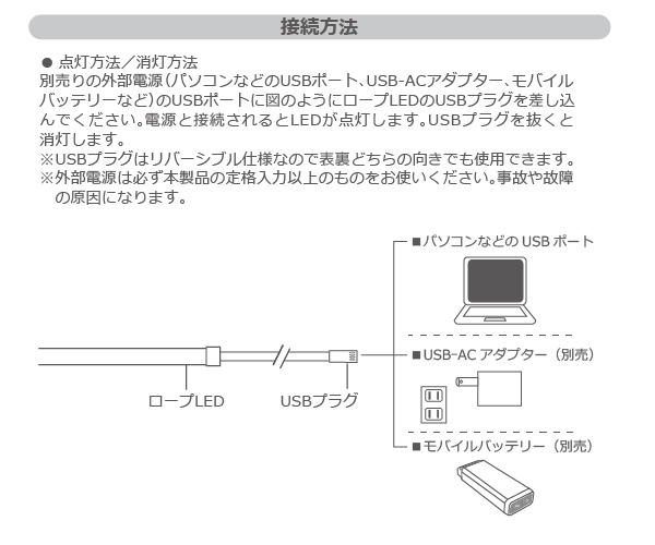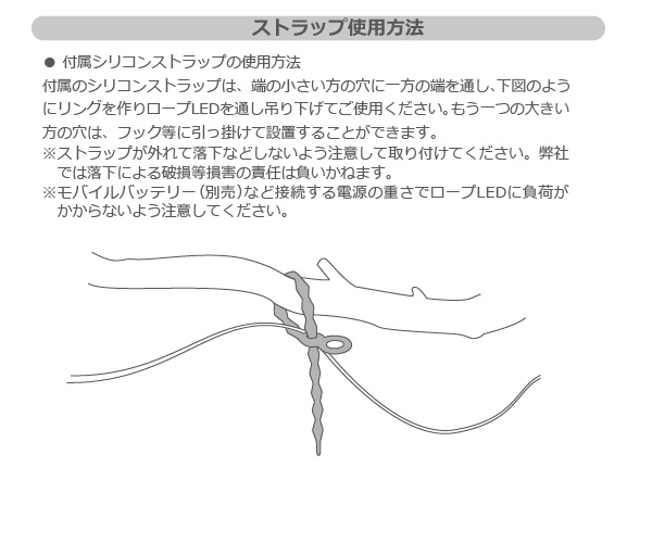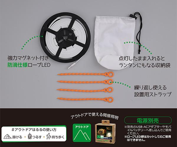 | 付属品 | ロープLED、ポーチ、シリコンストラップ×4、スライドマグネット×5 ※モバイルバッテリー等の電源部分は別売りです。 |