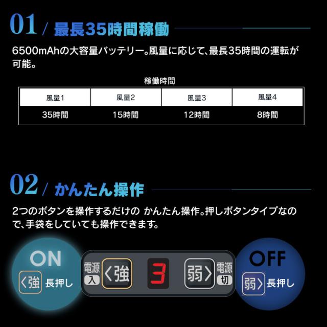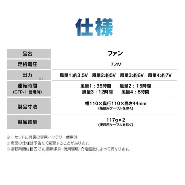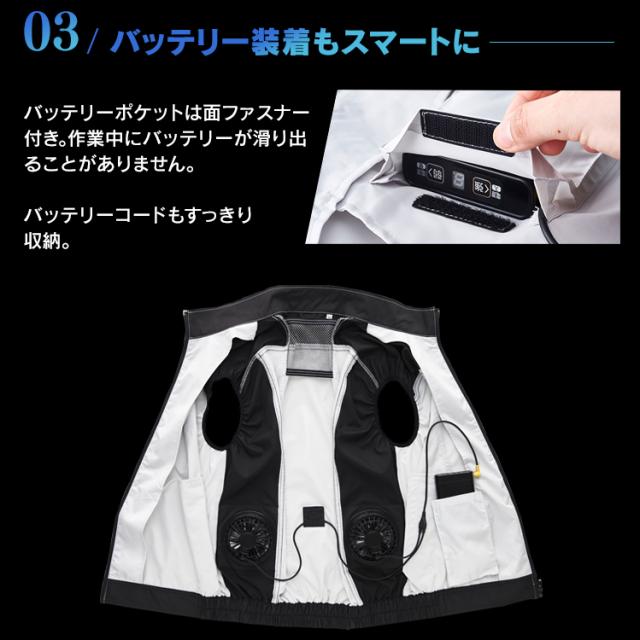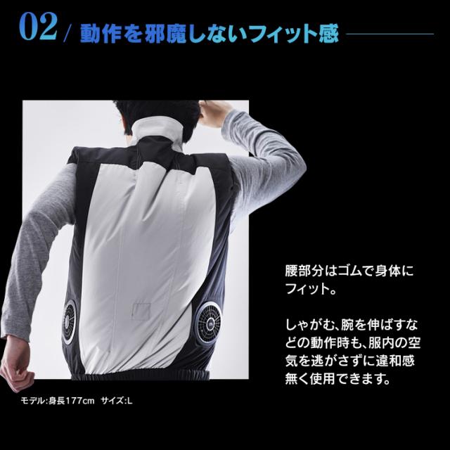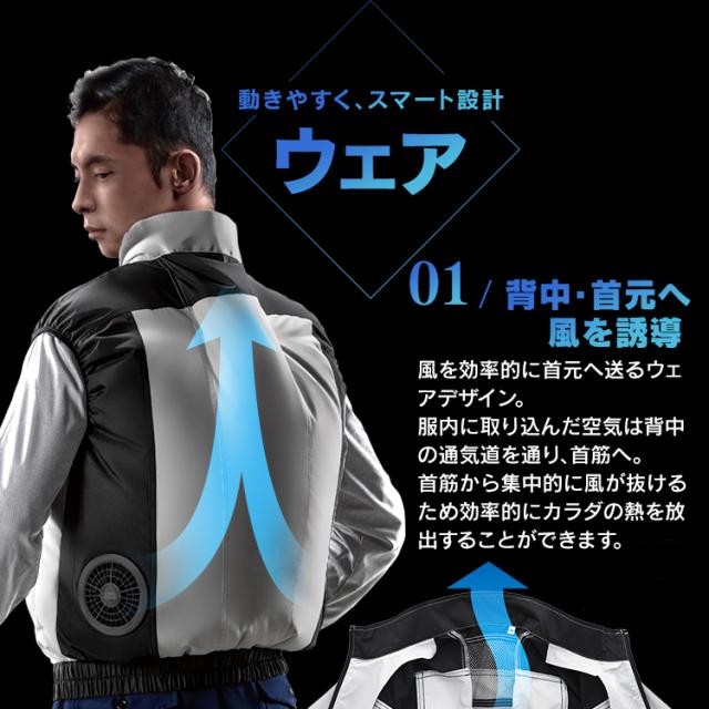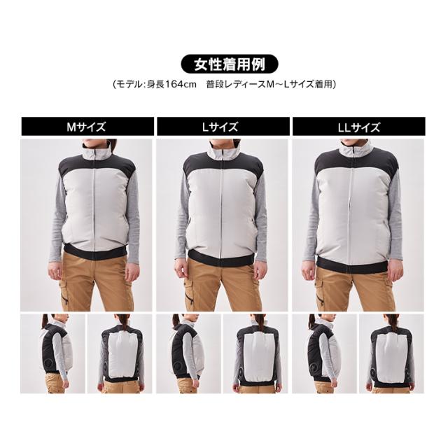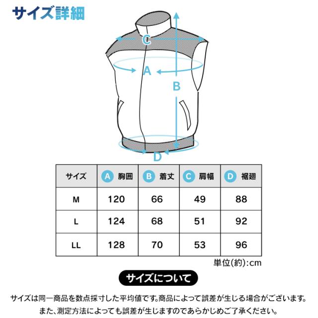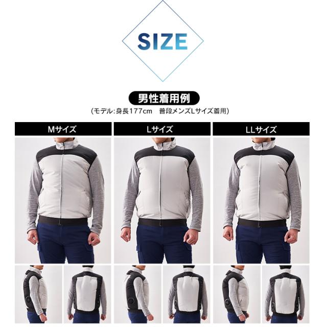 クールウェアプロのベストタイプ。動きやすく、スマート設計ウェア。背中・首元へ風を誘導します。動作を邪魔しないフィット感。しゃがむ、腕を伸ばすなどの動作時も、服内の空気を逃がさずに違和感無く使用できます。ファンが目立たないデザイン。ファン設置部分を同色系のデザインにすることでファンが目立たずスマートな見た目に。こちらはウェアのみの販売ページです。※ファン・バッテリーは付属致しませんのでご注意下さい●商品サイズ(cm)M:胸囲120、着丈66、肩幅49、裾廻88L:胸囲124、着丈68、肩幅51、裾廻92LL:胸囲128、着丈70、肩幅53、裾廻96サイズは同一商品を数点採寸した平均値です。商品によって誤差が生じる場合がございます。また、測定方法によっても誤差が生じますのであらかじめご了承ください。●カラーグレーネイビー迷彩