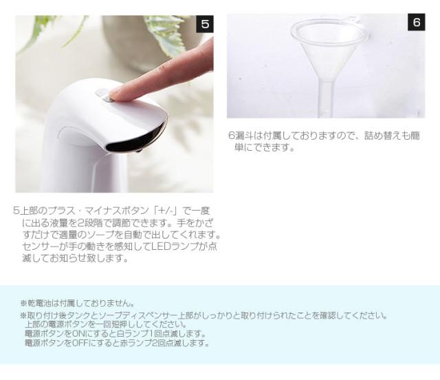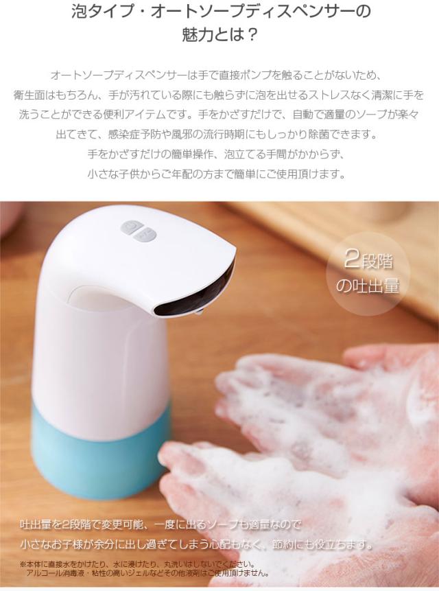 | ・オートソープディスペンサーは汚れた手で直接ポンプに触る必要がないため、衛生的で、周りが汚れにくいです。手をかざすだけで、程よい量のソープが楽々出てきて、インフルエンザや風邪の流行時期や食中毒の季節にもしっかり除菌できます。 ・泡ソープだけでなく液体洗剤も使え、手に取る時に泡で出てくるのでしっかり泡立てる手間がなく肌に優しいです。大人はもちろん、フワフワの泡にお子さんも大喜び、楽しい泡洗いで手洗いを習慣化するのにも最適です。 ・個人の好みや手の汚れ具合に合わせて、ハンドソープの吐出量がモード二種調節できます。 ・防水処理も施されているので水回りに設置することができます。 ・コンセント不要の電池式、置き場所を選ばず、台所にも洗面所の壁に設置できます。 ・様々な洗剤対応でき、液体タイプの洗剤は、濃度によって、洗剤1に対して水2-8程度の割合で希釈してよく混ぜて下さい。 ・便利で衛生的なので、家庭用はもちろん、幼稚園、病院、ホテル、オフィス、映画館など公共の場での衛生管理・風邪対策に最適です。 |