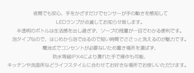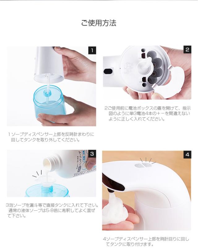 | ※本体に直接水をかけたり、水に浸けたり、丸洗いはしないでください。 ※アルコール消毒液・粘性の高いジェルなどその他液剤はご使用頂けません。 ※新品はご利用の前に、泡が出てくるまで少し時間かかるので、最初の数回は泡が出てこない場合がありますが、これは正常であり、少し待って数回試してください。 ※開封した時に、ボトルやポンプに少しの液体が残っているかもしれません。これらは出荷前の性能テストのためのハンドソープですから、正常な新品であり、ぜひ心配なくご利用ください。 ※商品画像の色合いは実物に極力近くなるよう努力して撮影しておりますが、撮影状況や光の当たり具合、お客様のモニターや携帯電話・スマートフォン等の使用環境などにより、色の見え方が異なる場合がございます。 ※色・イメージが違う等の理由による返品は一切お受けできません。予めご了承下さい。 |