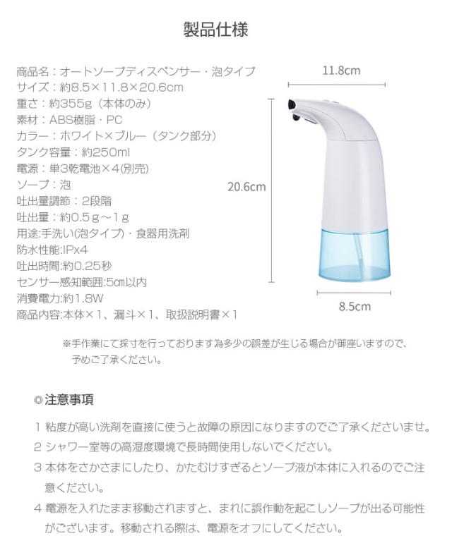 | 商品名:オートソープディスペンサー・泡タイプ サイズ:約8.5×11.8×20.6cm 重さ:約355g(本体のみ) 素材:ABS樹脂・PC カラー:ホワイト×ブルー(タンク部分) タンク容量:約250ml 電源:単3乾電池×4(別売) ソープ:泡 吐出量調節:2段階 吐出量:約0.5g〜1g 用途:手洗い(泡タイプ)・食器用洗剤 防水性能:IPx4 吐出時間:約0.25秒 センサー感知範囲:5cm以内 消費電力:約1.8W |