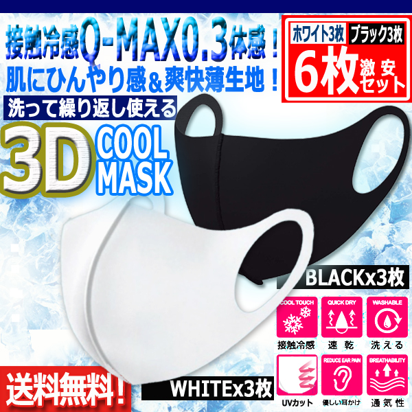 洗って繰り返し使える接触冷感「3DクールマスクQ-MAX0.3」[ホワイト3枚/ブラック3枚] (送料無料 夏マスク 冷感マスク ひんやり 通気性 速乾性 肌触り 伸縮性)