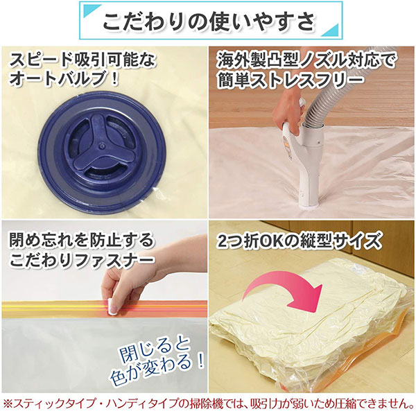 ※スティックタイプ、ハンディタイプの掃除機では、吸引力が弱いため圧縮出来ません。