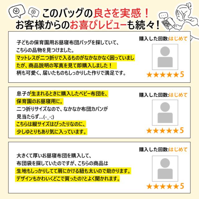 | 綿わたお昼寝布団上下セットが入るサイズのバッグです。 参考ふとんサイズ) 掛けふとん/105×135cm 参考ふとんサイズ) 敷きふとん/85×135cm |