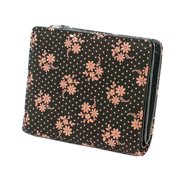 印伝 甲州印伝 印傳屋 上原勇七 財布 二つ折り財布 2217 コスモス 秋桜 黒地×ピンク漆 鹿革 本革 レザー 花柄 ブランド 冬ギフト バレンタイン 贈り物 YM01
