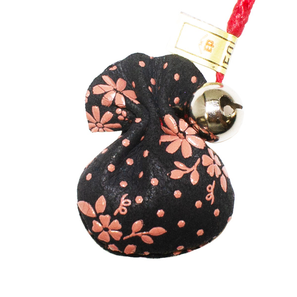 印伝 甲州印伝 印傳屋 上原勇七 ねつけ ストラップ 巾着 5102 コスモス 秋桜 黒地×ピンク漆 鹿革 本革 レザー 花柄 ブランド 冬ギフト バレンタイン 贈り物 YM02