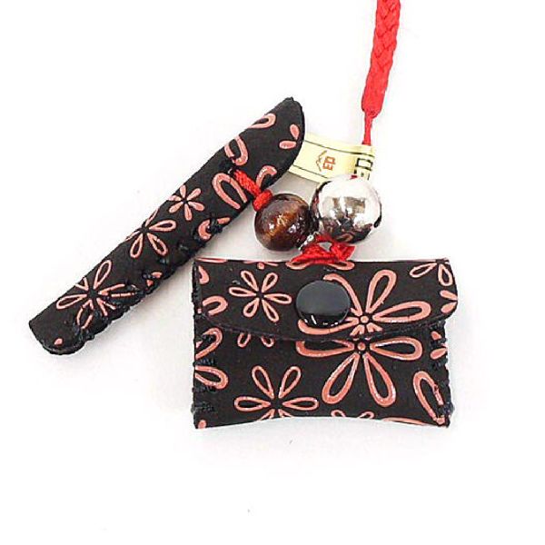 印伝 甲州印伝 印傳屋 上原勇七 根付 ストラップ 供紐 5104 雪割草 黒地×ピンク漆 鹿革 本革 レザー 花柄 ブランド 冬物 冬ギフト クリスマス 贈り物 YM02