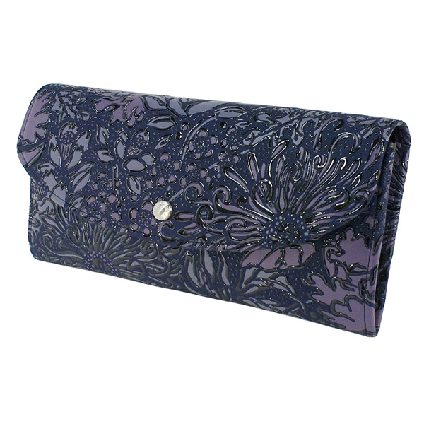 四季折々の花々が艶やかな印傳屋のオリジナルブランド。 柄は古来より日本で親しまれてきた、椿、梅、桜、藤、牡丹、菖蒲、菊の模様を紺地にシックな紫の濃淡ある更紗と漆で柄付けをしています。