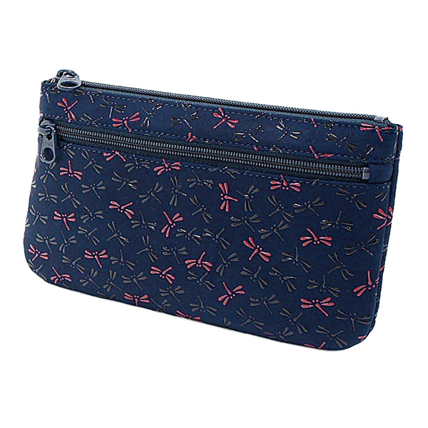 とんぼの躍動感が素敵な印傳屋のブランド。 古来日本人に勝虫(かちむし)として好まれてきたトンボ柄を紺地に赤漆と黒漆で二度漆付けしています。