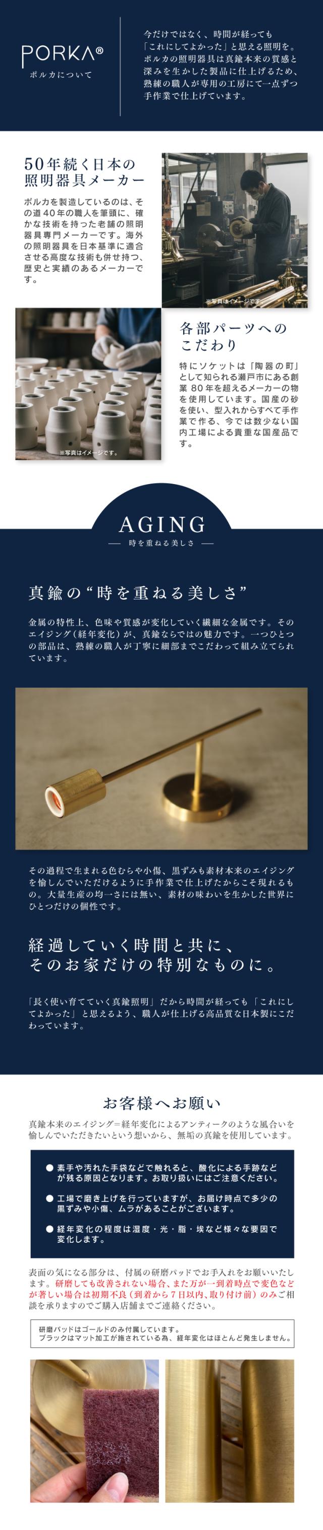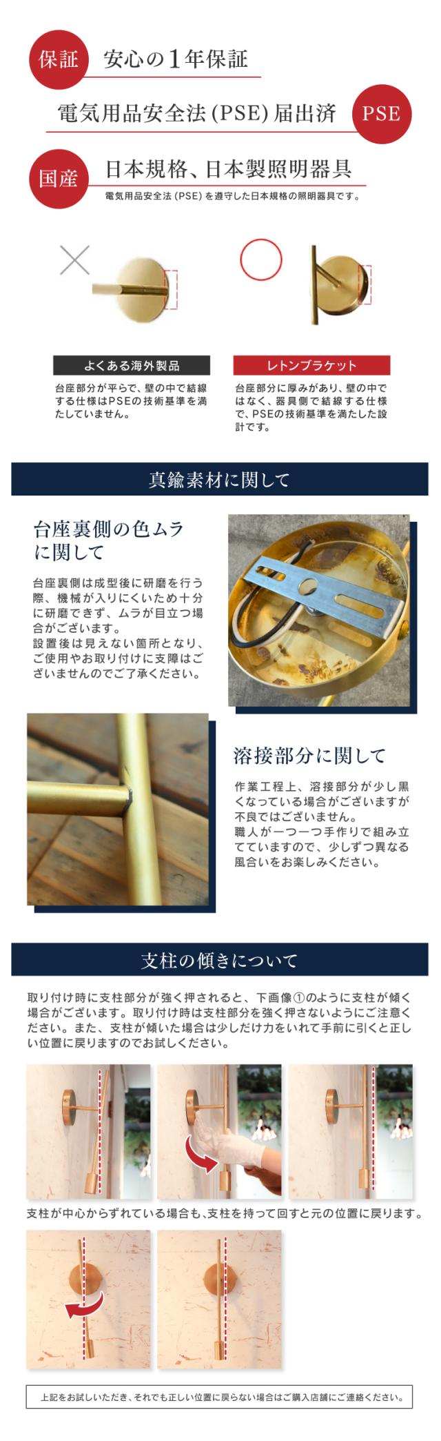 | 注意事項 | ●こちらの照明は、屋内の取り付けのみ対応です。 ●取り付け工事に関しては、専門店、工務店、電気工事店までご相談頂きますようお願いいたします。 ●傾斜のある天井・壁、凹凸のある天井・壁ではご使用いただけません。必ず平らな場所に取り付けてください。また、ネジ部分は補強材のある位置に取り付けてください。 ●画像はご覧になっているモニター、パソコン、環境などにより実際の商品と色味が事なる場合がございます。予めご了承ください。 ●【真鍮商品について】 真鍮の素材をそのまま活かすため色むらがあったりシミのように見える場合あります。商品によって一つ一つ異なりますが、製品の特徴として、また真鍮の変わりゆくアンティーク感としてお楽しみください。また、素手で触れた部分は変色の原因となりますので、取り付けの際は素手で触らないようにご注意ください。 |