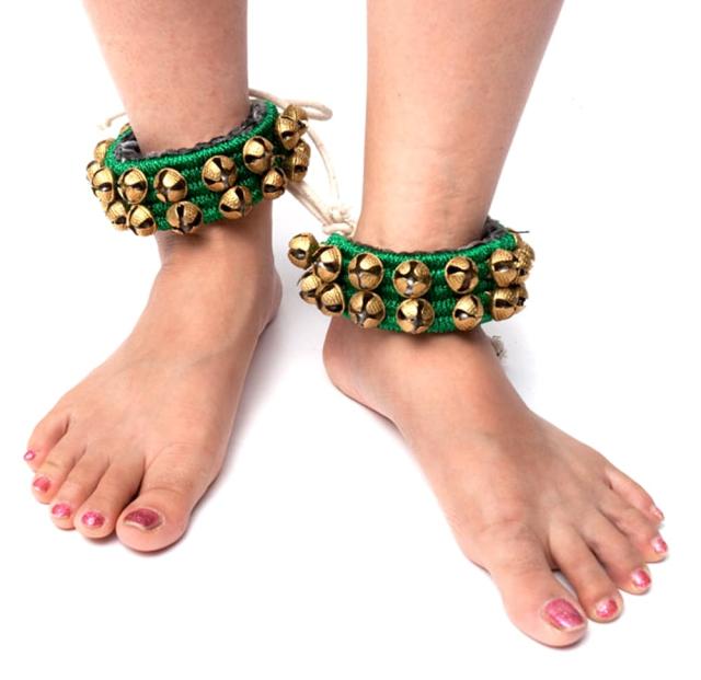 カタックダンスの時に足につけて音響効果を出す為の足鈴です。こちらはデリーの専門店で作成しているカタックの踊り手さん用のグングルで、長時間踊っても足に傷がつかないよう、パッド付きになっていて、裏面はベルベットで覆われております。一個一個のグングルの大きさは通常タイプ。そこまで大きな音が出るわけではありませんので、ステージの上だけでなく、野外フェスに行く時に付けて行くこともできますね。
