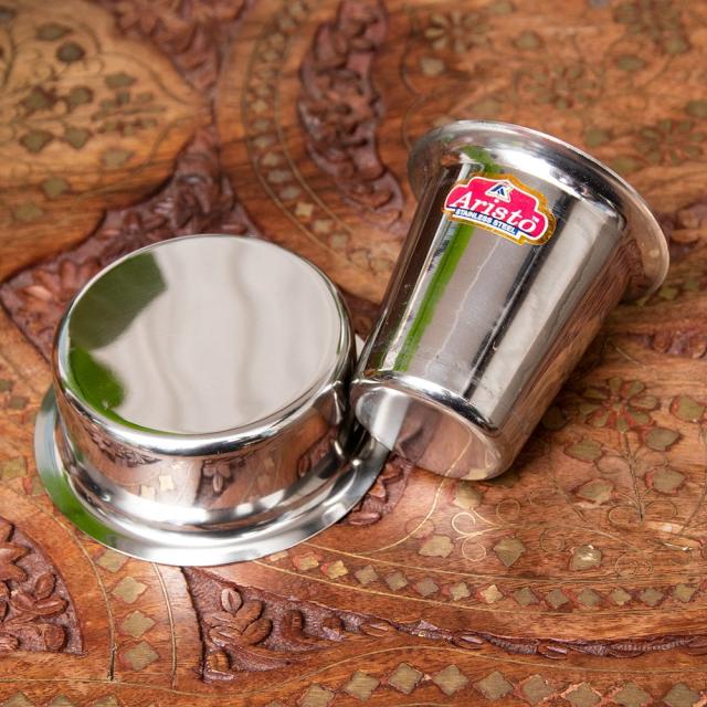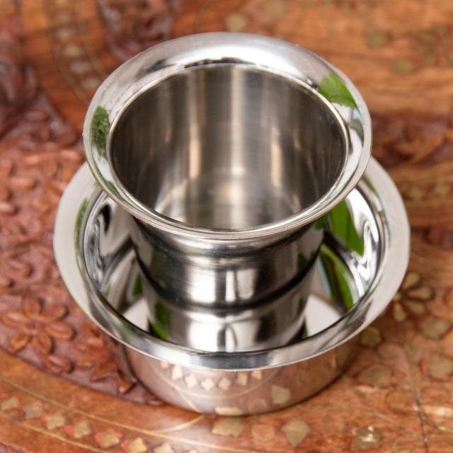 こちらは、コーヒーカップとソーサーがセットになっているので、すぐに南インド式コーヒーを楽しめます。ステンレス製で、周りの風景を写しだしてくれるので、場所によってさまざまな表情を見せてくれます。