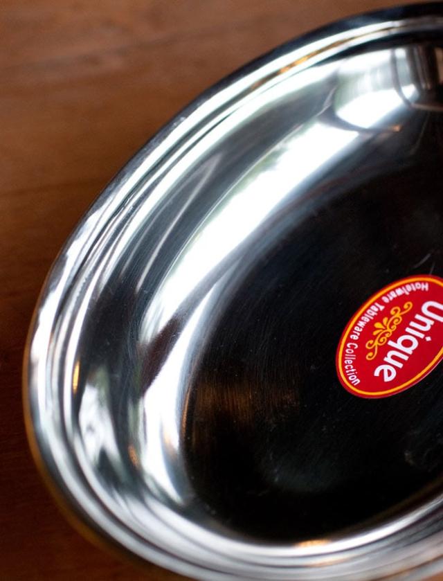 カレーやビリヤニなどにぴったりな、ステンレス製のオーバルプレートです。インドでは食堂などで使われております。重ねて収納できますので、食器棚のジャマにもなりません。■ステンレスと銅の二層構造
