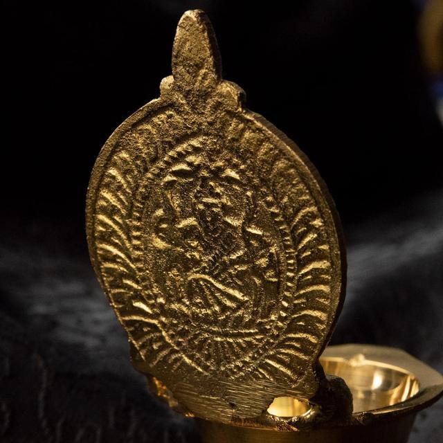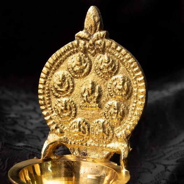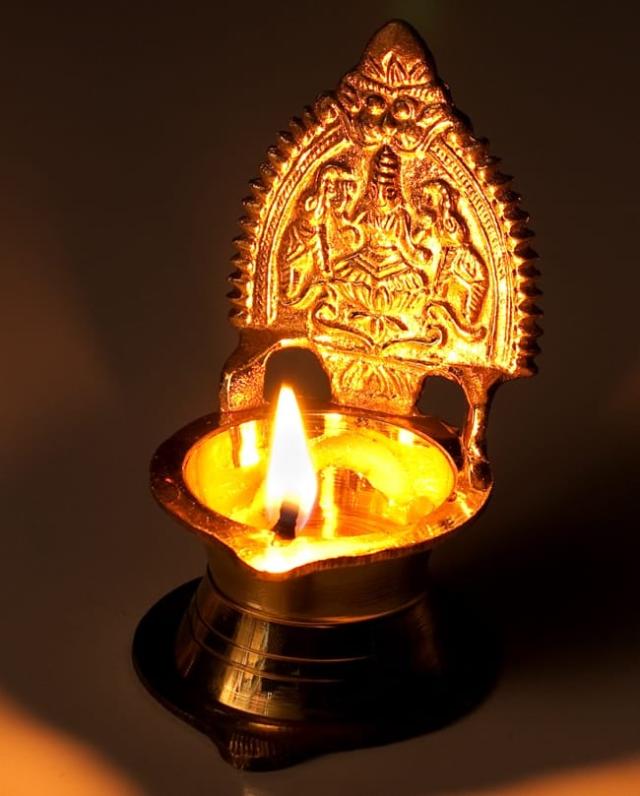 火を灯すと、ブラスは綺麗に輝きラクシュミの立体的な装飾が綺麗に浮かび上がります。