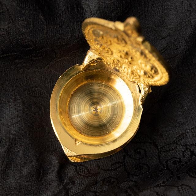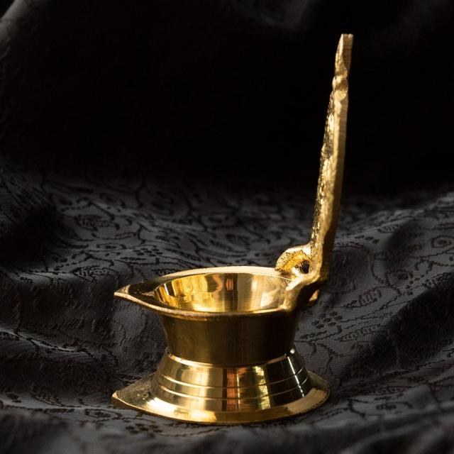 ラクシュミのオイルランプ&香立てです。お香はコーン型のものが使えます。オイルランプにする時はコットンをひねり灯心にし、オイルランプ用の煙の少ないオイルやサラダ油等を燃料にします。火を灯すと、ブラスは綺麗に輝きラクシュミの立体的な装飾が綺麗に浮かび上がります。